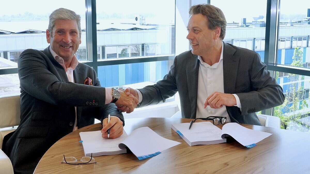 Julian Hobbs, CEO, Siemens Financial Services UK (left); and Arnout Damen, CEO, Damen signing the agreement (Source: Damen)